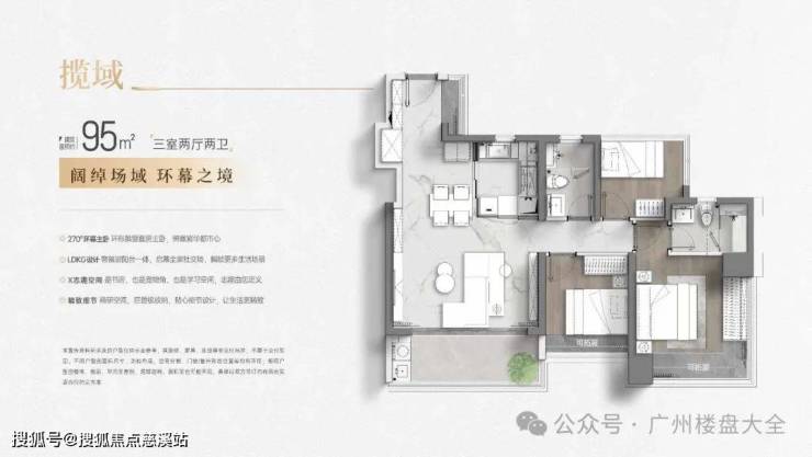 95㎡户型,也是三房两厅户型,南北对流,空间感会比86㎡更强,户型整体更为方正。 至于和市面上同面积段产品比,也算是各有亮点,比如未来方洲的95㎡,采用的是横厅设计,阳台尺度更大。