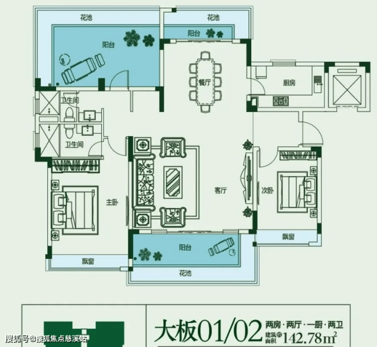 建面约143㎡,2房2厅1厨2卫