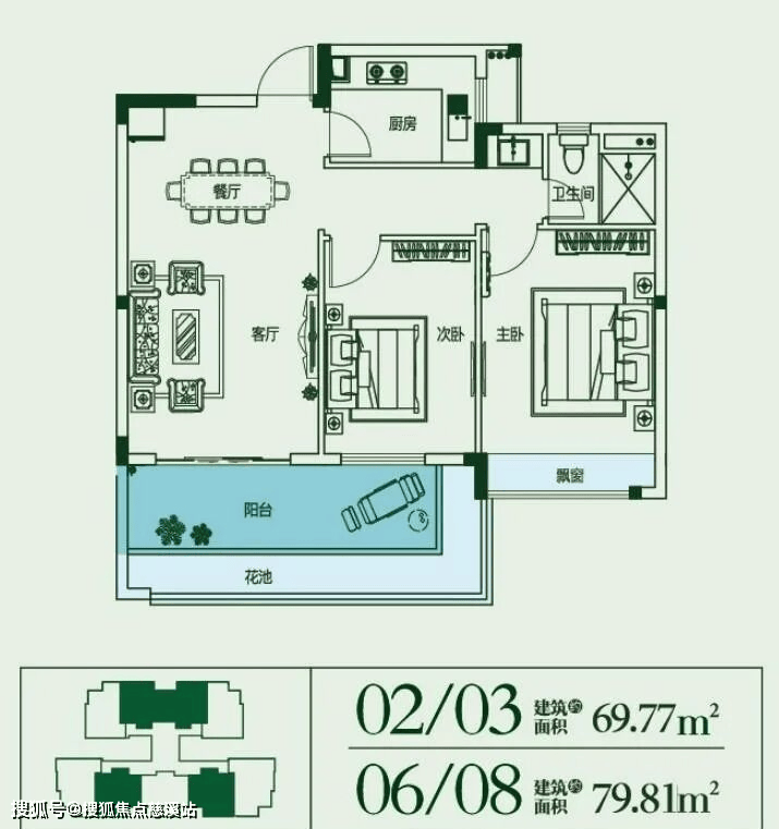 建面约70~80㎡,2房2厅1厨1卫