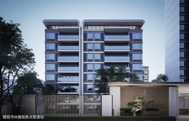 首层单元门头:采用弧形飘檐和竖向格栅,展现优雅灵动的风格。
