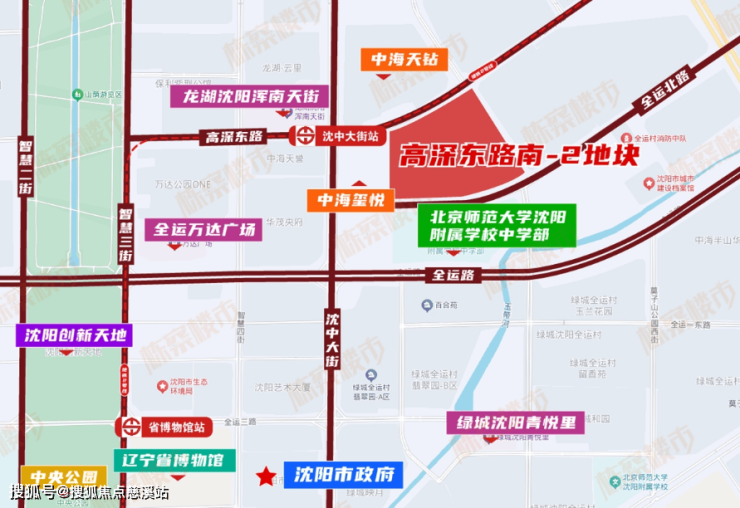 从区位上来看,高深东路南-2地块位于整个新市府板块最为核心之处,距离天街商场、地铁2号线沈中大街站步行不到300米,全运万达广场步行距离1.1公里;市政府、创新天地、中央公园、沈阳国际软件园以及包括辽宁省科技馆、辽宁省博物馆在内等大型文化场馆,均在项目2公里辐射圈范围之内。
