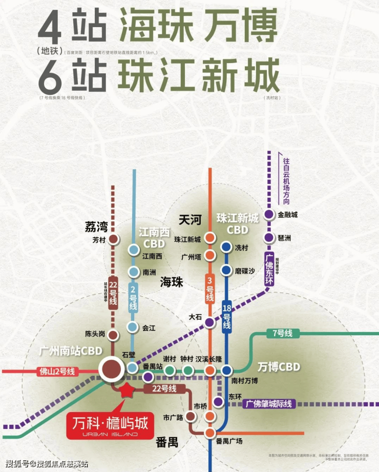 枢纽基底:项目坐落在广州南站商务区核心,15轨交汇(4地铁+5高铁+6城轨),22号线后通段今年通,5站到白鹅潭;广佛环线东环2025年通车,30分钟到白云机场、串起琶洲金融城。