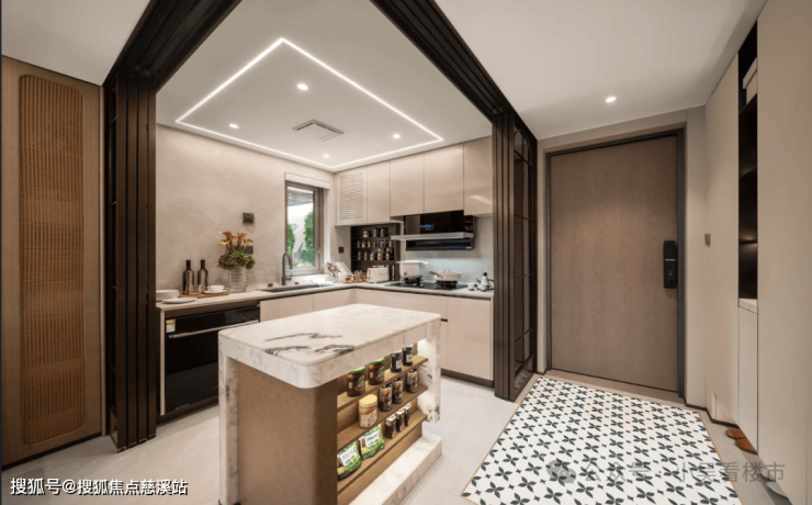 项目交标也比较高,一进门是铸铝大门,因为经过高超工艺处理,铸铝大门长时间使用依然光亮如新,展现出高质感和耐用性,玄关地面拼花设计,每一寸纹路既是色彩的私语,也折射出你生活中的光影。