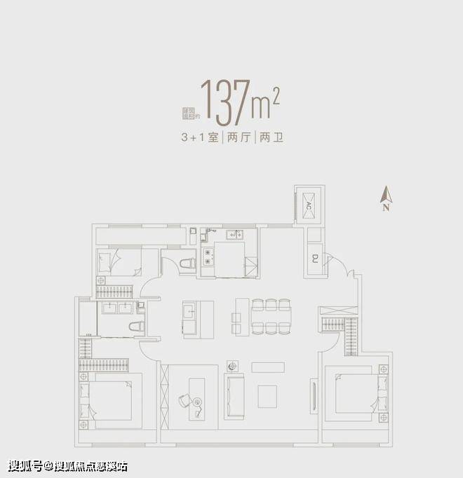 137㎡宽厅三室。这个户型最大的吸睛点是14.2米巨幕南向四面宽,巨幅采光,无界视野。