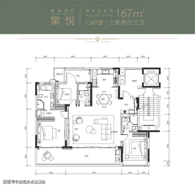 该户型采用三套房设计,实现了动静分离。从玄关入户,右侧是三间全套房卧室,每间都带有独立卫浴。