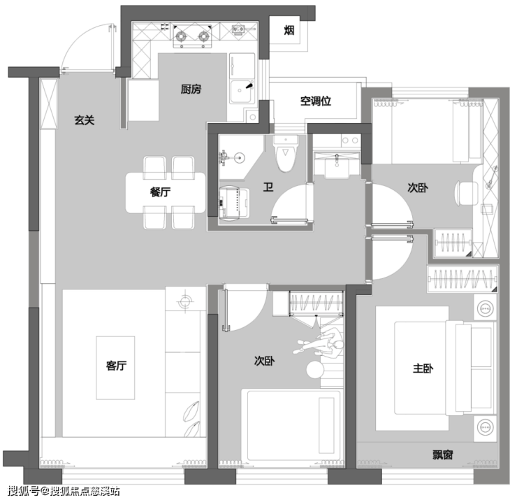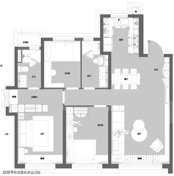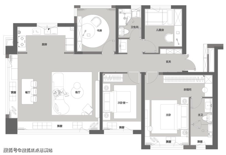 2、小家化主卧套房;采光衣帽间、情景飘窗、独立卫浴三位一体,私享时光的尊崇感