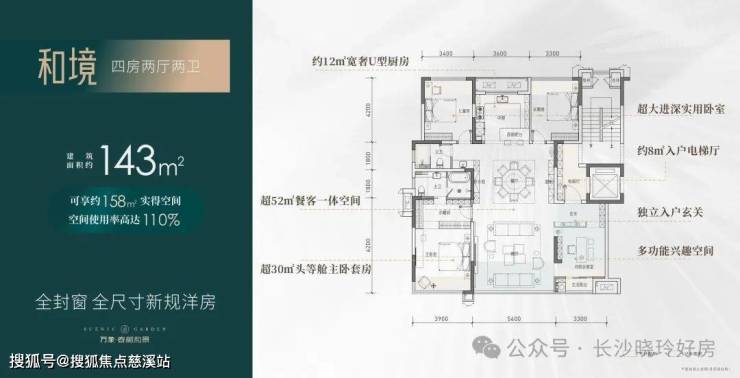 【四房两厅两卫】建筑面积约:143㎡;实得面积约:158㎡;实际得房率110%;,相当于旧规186㎡!(旧规户型按85%得房率计算,仅供参考)
