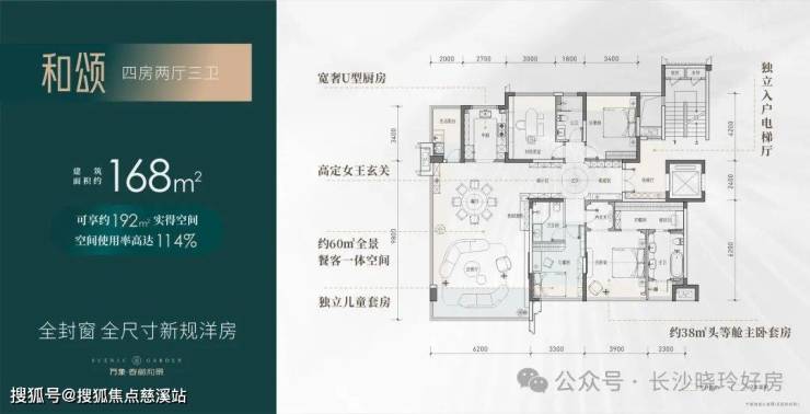 【四房两厅三卫】建筑面积约:168㎡;实得面积约:192㎡;实际得房率114%;相当于旧规226㎡!(旧规户型按85%得房率计算,仅供参考)
