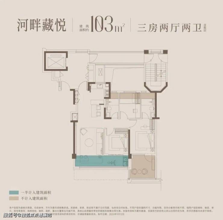 ・103㎡小高层户型:采用三开间朝南布局,注重收纳功能,玄关柜容积约4立方米,厨房通过优化布局预留更多操作空间。该户型还配置了两款可选的背景墙设计,主卧套间配备独立露台。在配置方面,与152㎡户型保持一致,包括智能门锁、空调新风系统、品牌厨电及卫浴等。