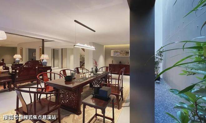 负二层品茶区设2.2米茶桌、6茶椅,配以雪山吊灯。该区借天井引入自然光与绿植,营造优雅自然环境。简约设计融合古典家具,赋予空间文化底蕴与心灵归宿。此地,观自然之妙,悟古今幽情,挂饰文征明《兰亭修褉》金笺画卷,更添风雅。