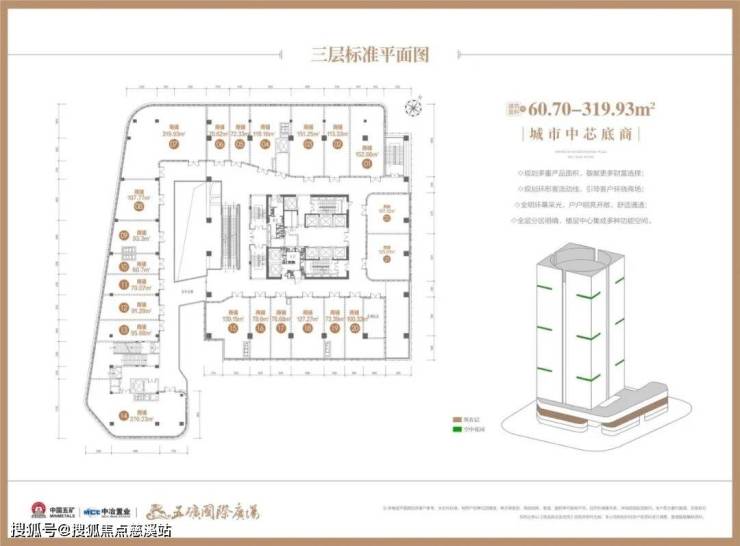 【楼栋概况】楼体高度110米,地下二层地上22层,1-4层为城市中芯底商,首层层高约6米、2层层高约为4.5米、3/4层层高约为4.35米;5至18层为国际商务空间,层高约为4.2米。