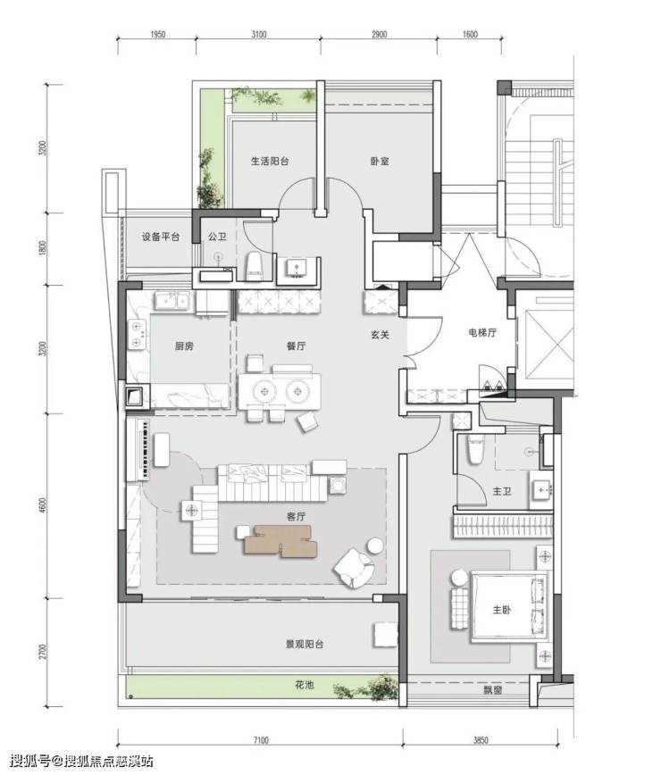 亮点:南向客厅面宽7米进深4米,空间利用率高,L型厨房联动客厅,南向面朝景观公园带。