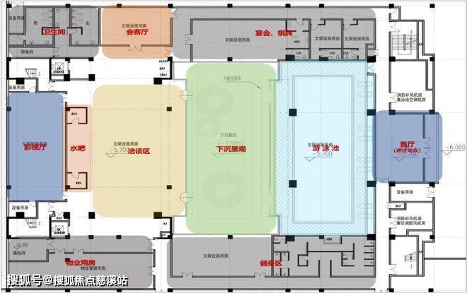 下沉会所围绕中庭景观共分为商务会客厅、社区剧院、瑜伽室、红酒吧、家庭宴会厅、棋牌室、恒温泳池、运动健身区、更衣室等9大功能区,麻雀虽小五脏俱全。