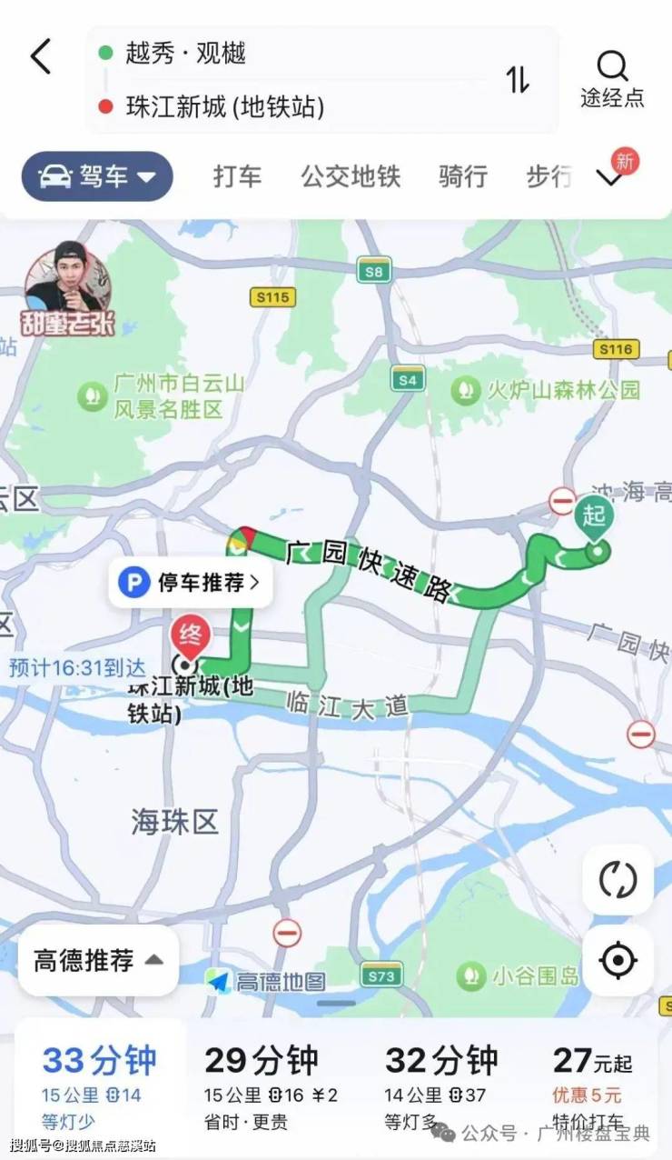 自驾珠江新城:走广园快速路转天河东路即可到达珠江新城,全程15公里耗时33分钟,打车27块。