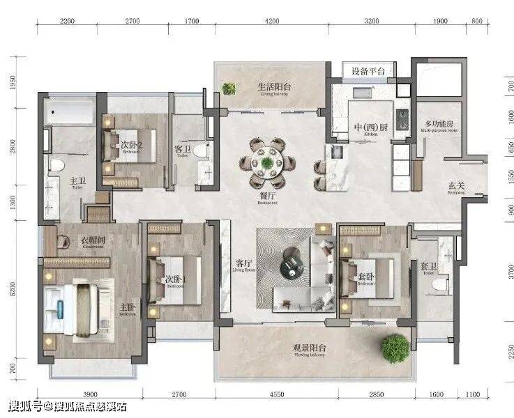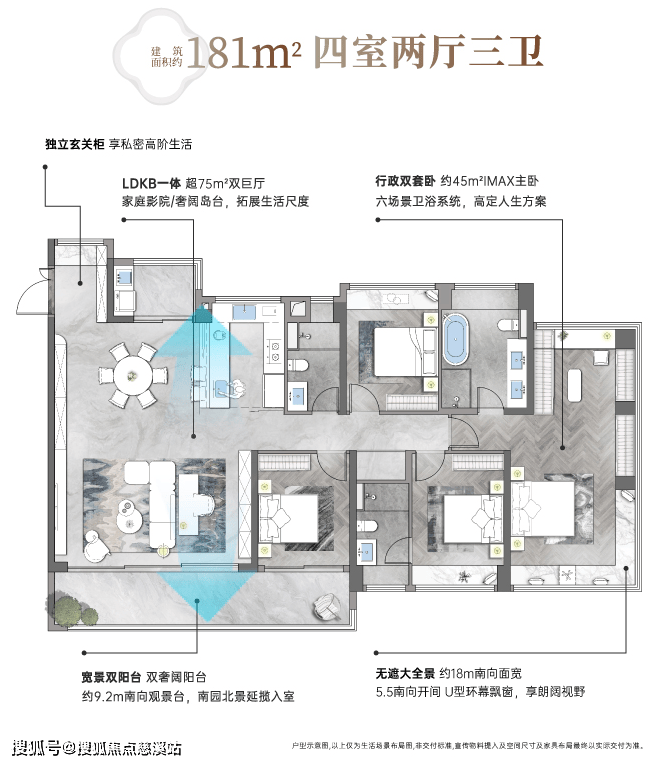 建发缦云183㎡户型秉承了建发缦云系列产品的优越基因,南向面宽约18米,配备南向约9.2米景观大阳台,双套房+品牌装修,空间布局通透,动静分离。
