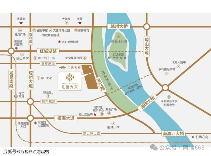 项目位于海口琼山区滨江路中段,属于靠近国兴的位置,东侧是南渡江。