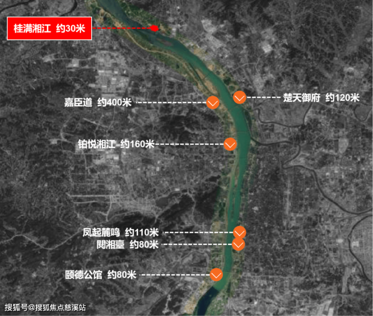 放眼全长沙,像桂满湘江如此亲江的楼盘不多见(仅约30米的亲江距离),哪怕是主城区动辄2万+/㎡、甚至3万+/㎡的大平层豪宅,最靠近江面之处也都在80米及以上。