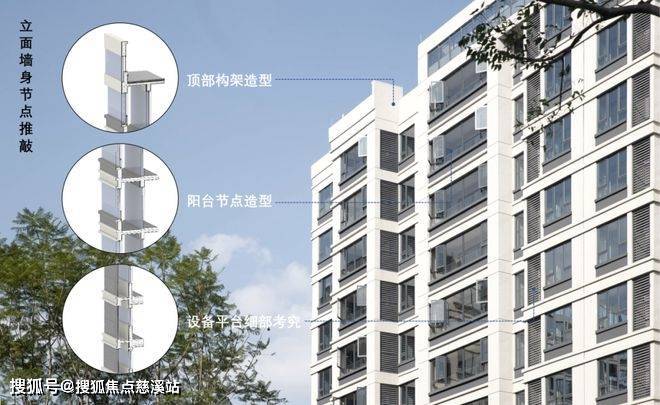 楼栋立面为现代风格体系,注重立面的对称,利用新材料和新结构的搭配,追求简洁现代美。材料的选择注重质感与色彩的统一,采用米黄为主、深灰为辅的色调建筑表皮,辅以简约边框设计,使立面更加简洁轻盈。