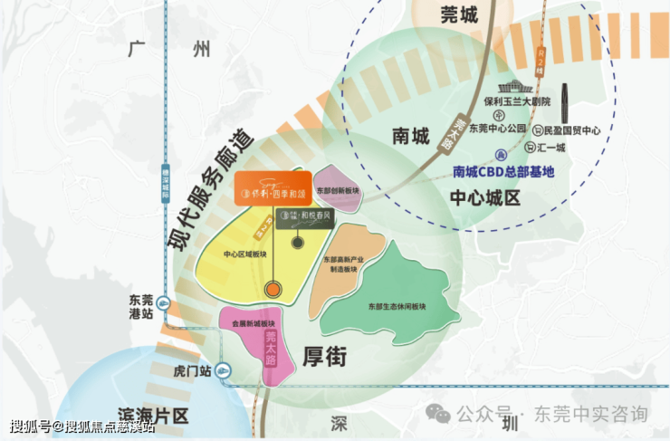 保利·四季和颂所在的厚街CBD中央商务区,总面积约为150公顷,锚定科创服务功能发展定位,打造“多元智汇绿谷、立体复合新城”的新兴城区,现已引进慕思企业总部、东莞农商银行等高新企业,打造省道沿线地标建筑,未来将以显赫实力成就东莞”门面担当。