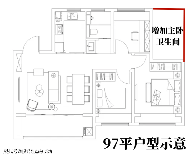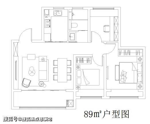 这是原先项目89㎡户型图:横厅设计,客厅约5.3米横厅,南向双开间阳台,三个房间全部带飘窗。现在主卧变套房,直接变成97㎡三房两卫户型,也更适合区域刚改家庭。