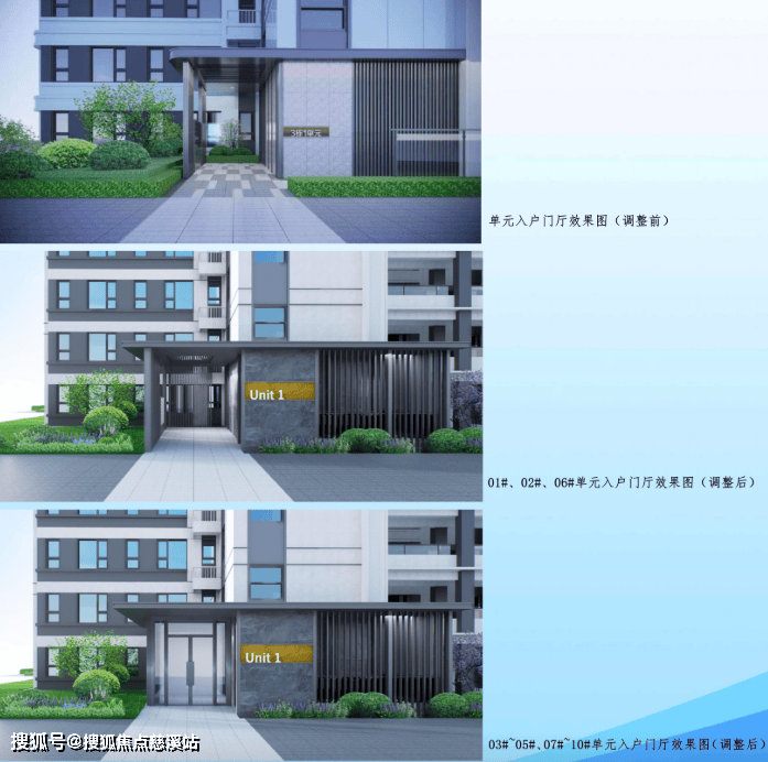 此外,入户大堂门厅等也做了调整,扩大了单元入户门厅,扩大了雨棚范围,调整隔栅样式。