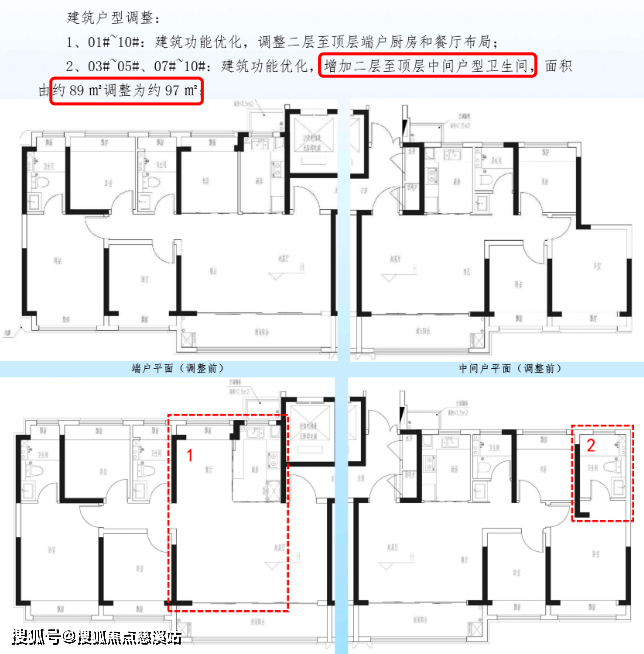 根据规划调整,现在1-10号楼,二层至顶层的120㎡边户户型,厨房和餐厅布局有细微调整,厨房面积变大,疑似增设岛台;同时3-5号楼、7-10号楼,二楼到顶楼的中间户,户型面积调整,增加了主卧卫生间,从89㎡改为97㎡!