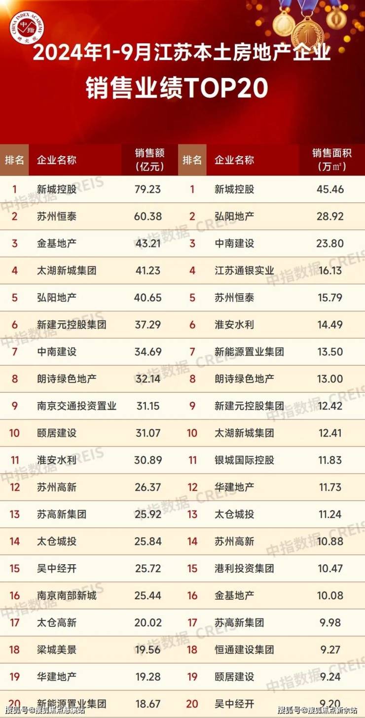2024年1-9月,江苏省房企TOP20门槛值为43.21亿元、19.80万平,TOP4房企销售业绩均超120亿元、50万平。其中,销售金额榜方面,保利发展以277.65亿元荣登榜首,招商蛇口、万科分别以182.98亿元、135.22亿元紧随其后;销售面积方面,保利发展、万科、招商蛇口分别以102.63万平、68.86万平、66.57万平位列榜单前三位。新城控股、苏州恒泰、金基地产、弘阳地产、中南建设等江苏本土房企表现亮眼,均入围房企销售业绩TOP20榜单。
