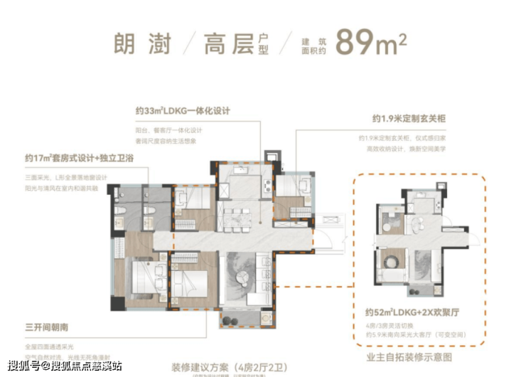 89㎡边套四房得房率90%,创下岛内小面积做到边套四房的先例,让年轻家庭一步到位;高性价比,中高楼层折后总价不会超过410万。