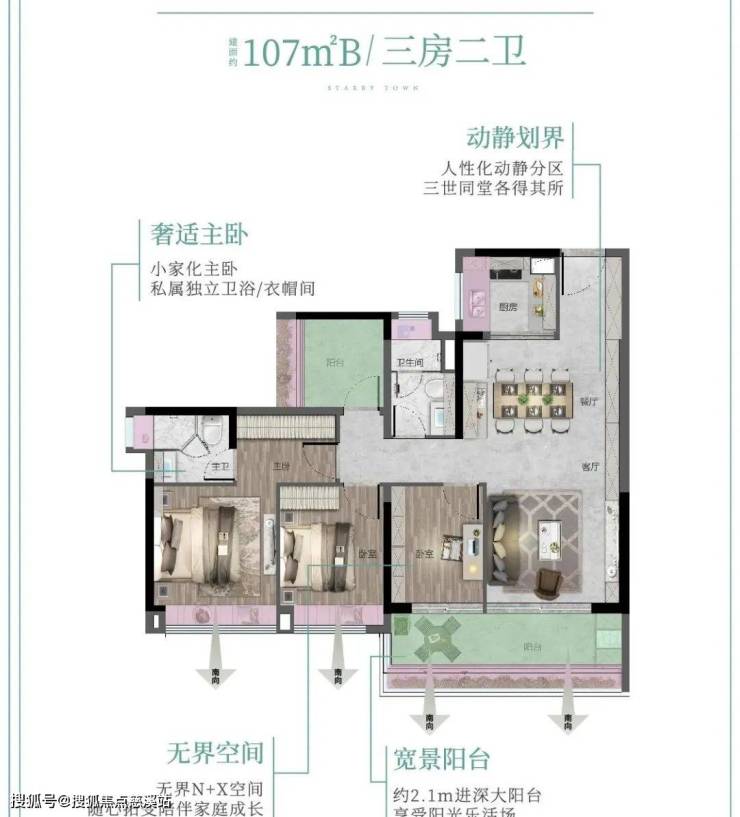 107㎡A 4空间2厅2卫,4.5 开间朝南,客厅主卧双南北对流,5.9米长观景阳台!交互式方厅,可开可合