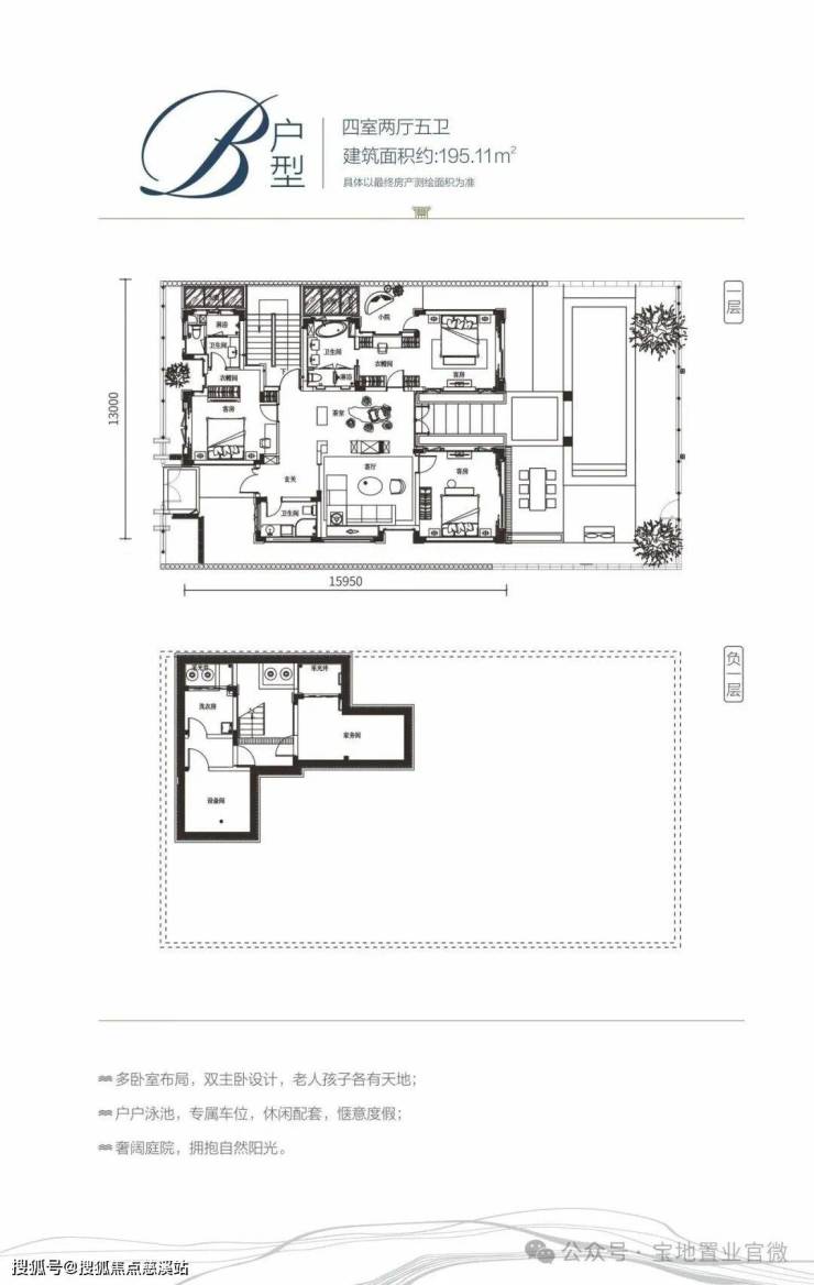 B户型规划面积约195㎡,实得约355㎡,院子约140-240㎡