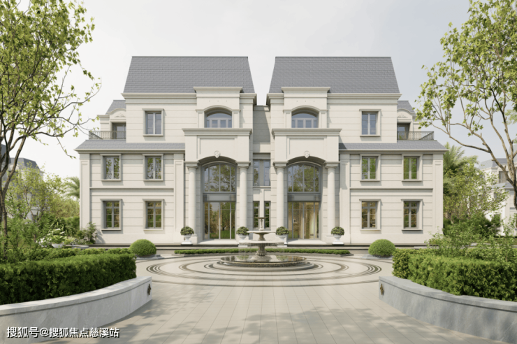 孟莎式屋顶、古典拱心石、对称式构图,配合干挂石材的厚重质感,都在向法式庄园的仪式感致敬。