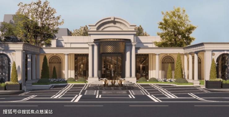 社区大门打造了近50米法式门庭,中央是定制水景,两侧矗立着5.5米高的整石立柱。