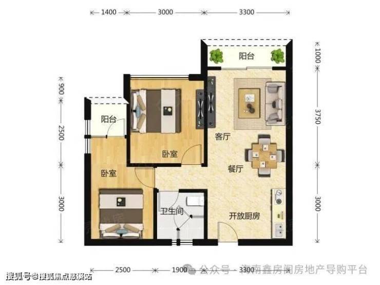 B户型两房一厅一卫: 50㎡送14㎡ 实得64㎡。
