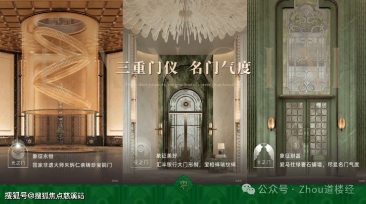 【三重门仪】光之门由国家非遗大师朱炳仁亲铸珍宝铜门象征永恒,花之门以宝相祥瑞纹样寓意美好,水之门以爱马仕绿彰显财富气度,复刻名门归家仪制。