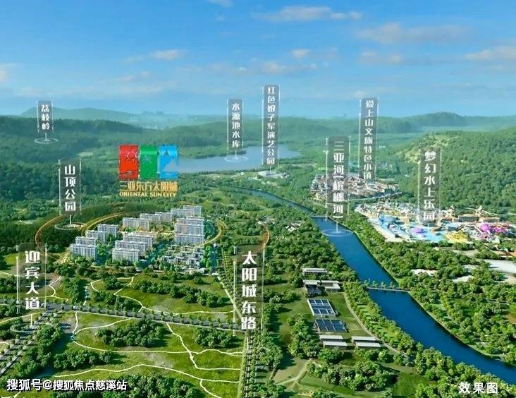 三亚·东方太阳城,西卧山顶公园,东拥三亚河(槟榔河),近享水源池水库、荔枝岭生态景观,面朝三亚主城区、三亚湾等,以山河为靠,以繁华为景,打造天赋上境栖居地。