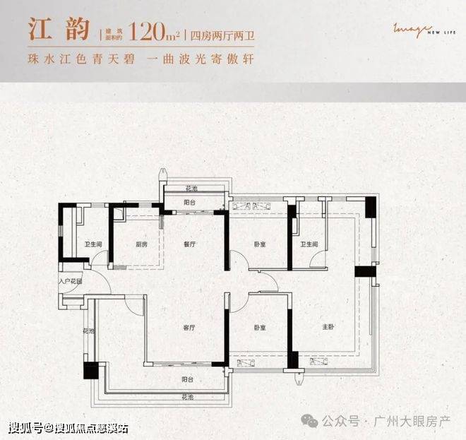 建面约120㎡:四房两厅两卫设计,四开间朝南,居住与生活动静分离,南向大阳台或南北双阳台,主卧带270°飘窗