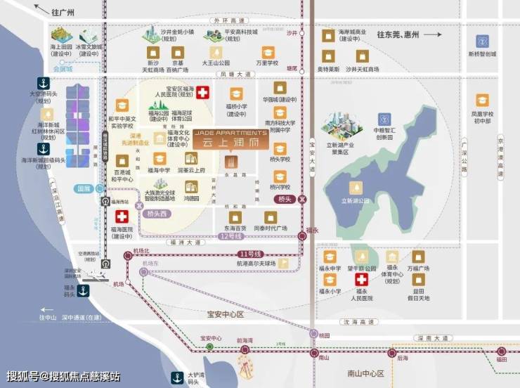 铁:穗惠深城际铁路(福海西站直线距离约1500米、深圳机场站),延线可直达福田中心区