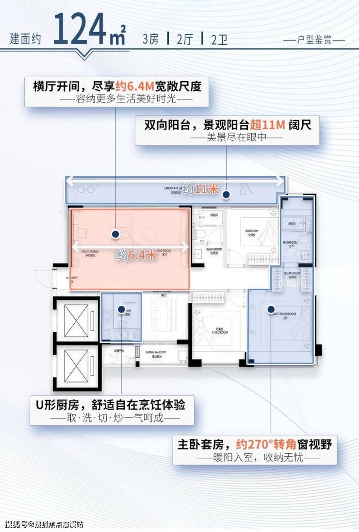 最具性价比的124 ㎡三室两厅两卫,得房率更是突破90%。