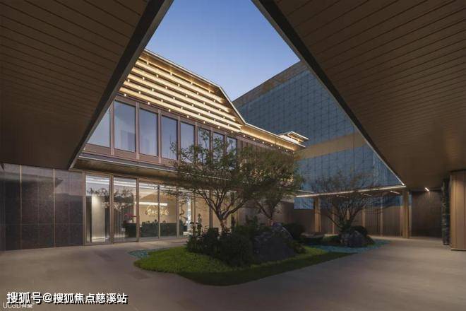 入口庭院以装置艺术元素为点睛之笔,将江南建筑的屋檐与层叠山脉融为一体。设计独具匠心,创造了层叠错落的檐口。与此同时,景墙沿着双拜岗牌楼路一直延伸,与庭院景观装置相结合,巧妙地围合出私密而独享的空间,将街道的喧嚣隔绝在外。