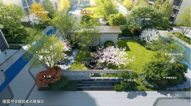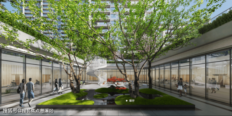下沉式会所踏水幽庭中,镜钢旱溪映乌桕林影;交映童梦的樱花秋千与水纹乐园被草坪串联,孩子身影与四水归堂的枯山水涟漪,共谱"四方来水"之意。