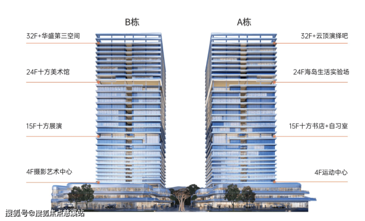 项目规划A、B两栋32层超高层办公楼(高度149米)以及C、D、E栋3层独立商业。打造集时尚、人文、艺术、商务、社交、生活6大功能于一体的“垂直社区”,涵盖办公空间、零售空间、生活空间、公共空间。