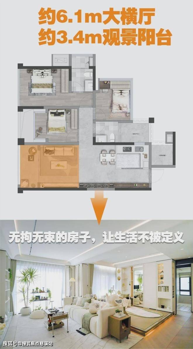 通常市面上建筑面积100㎡左右的房子除掉公摊之后,套内使用面积在85㎡左右,而未来城市这个新规之下的75㎡户型,套内使用面积就达到85㎡,足以与一个建面100㎡的房子相抗衡,用小三房的价格,便能够拿下等同于市面近100㎡的房子,可谓大大降低了年轻人置业的负担。此外,该户型还是稀缺的南向小户,灵活改造后还可享受约6.1米的大横厅,小户型也可以实现大享受,可谓亮点十足。