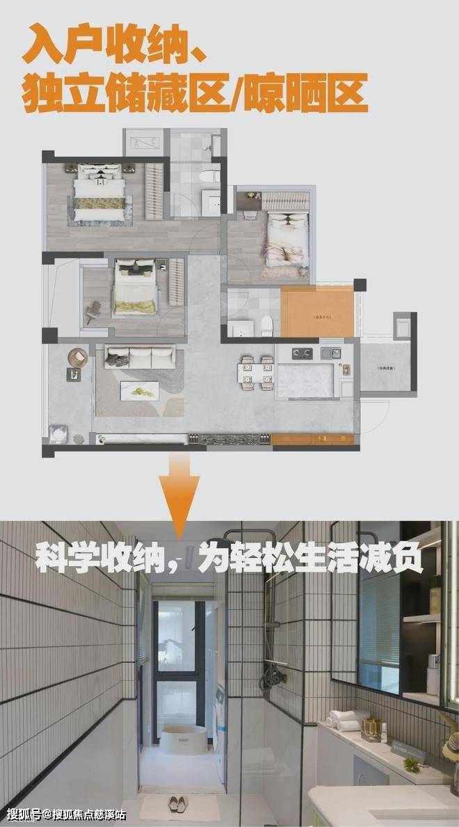 75㎡户型在收纳储藏上用尽心思,入户处打造超深、超宽尺度储物排柜的同时,保证入户的宽敞性,更便于放置包包、鞋子、雨伞等杂物,让出门与归家都更轻松便捷。还规划一个连接次卫的超级便捷独立储藏区,可以放置杂物、晾晒衣服,放置铲屎官作战的猫砂盆。这不仅仅是一个储藏区,更是一个让生活更加井井有条的秘密武器。