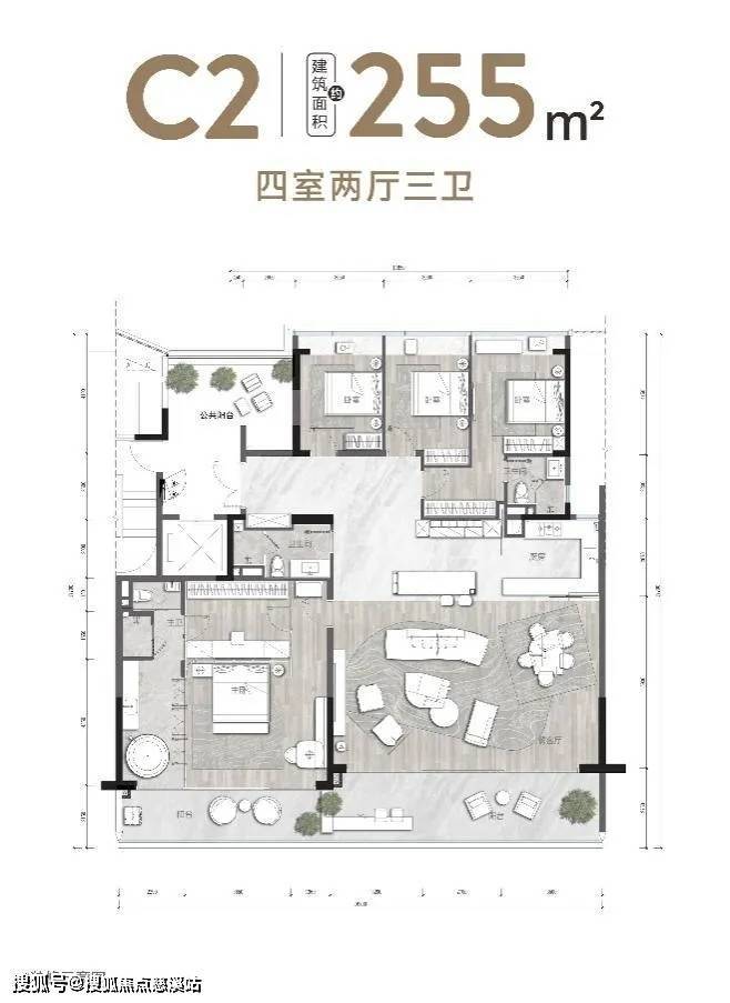 319㎡ 户型为例,四室两厅四卫格局,为高端家庭拓阔生活尺度;