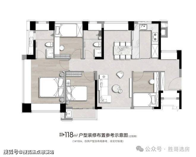 而118平的4房户型,直接做了个5开间且3房朝南,独立的入户空间,开放式厨房+南北通透的餐客一体,主卧南北通透带2个超大飘窗,同样是集美新城核心区遥遥领先的存在。以后放二手,也很有竞争力。如果喜欢超大客厅的,118户型也可以提供个性化定制,把靠近入口位置的卧室变成客厅的部分。
