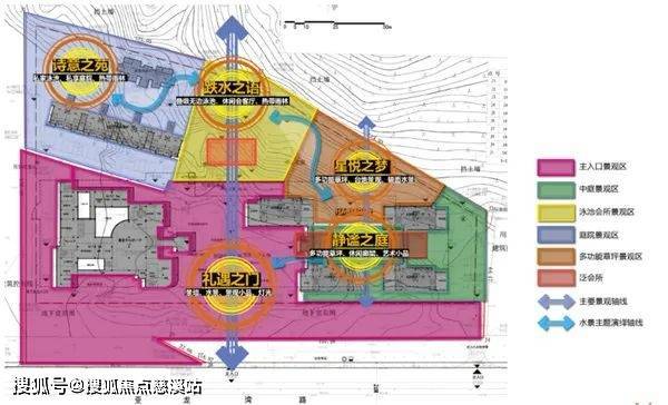 项目分为5大主题分区,分别是礼遇之门,静谧之庭,星悦之梦,跌水之语,诗意之苑。