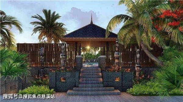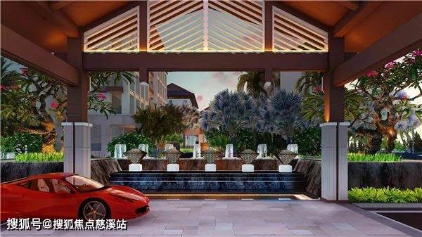 主入口景观:由景墙、水景、景观小品、灯光、热带特色棕榈植物营造热带特色风光和打造项目入口的昭示性。