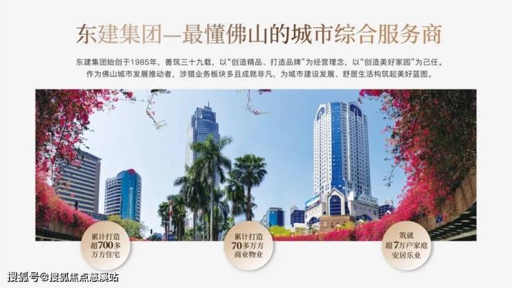 【天赋品牌 39载实力筑家】——东建集团,致力成为佛山最具价值的城市综合服务商,39年来累计开发了700多万㎡住宅和70多万㎡商业物业,筑就超过7万户家庭安居乐业,总资产规模超200亿;涉猎业务板块多且成就非凡,为佛山城市建设发展、舒居生活构筑起美好蓝图。