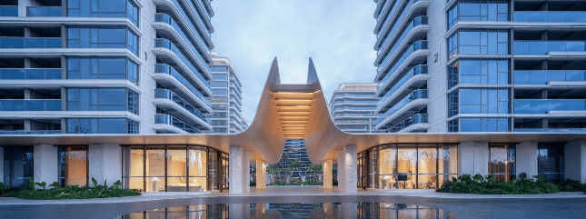 材质上精选铝板、石材与质感涂料,既能抵御三亚气候的侵蚀,又赋予建筑高端品质感,使建筑与海风、浪涛自然呼应,实现 “与自然同频共振” 的设计理念。