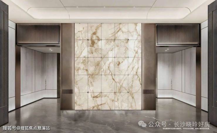 酒店式精妆双大堂设计,挑高敞阔格局,引入造型背景墙,金属与石材结合,点滴之间皆为金茂匠心。专属电梯厅,高规格入户仪式。